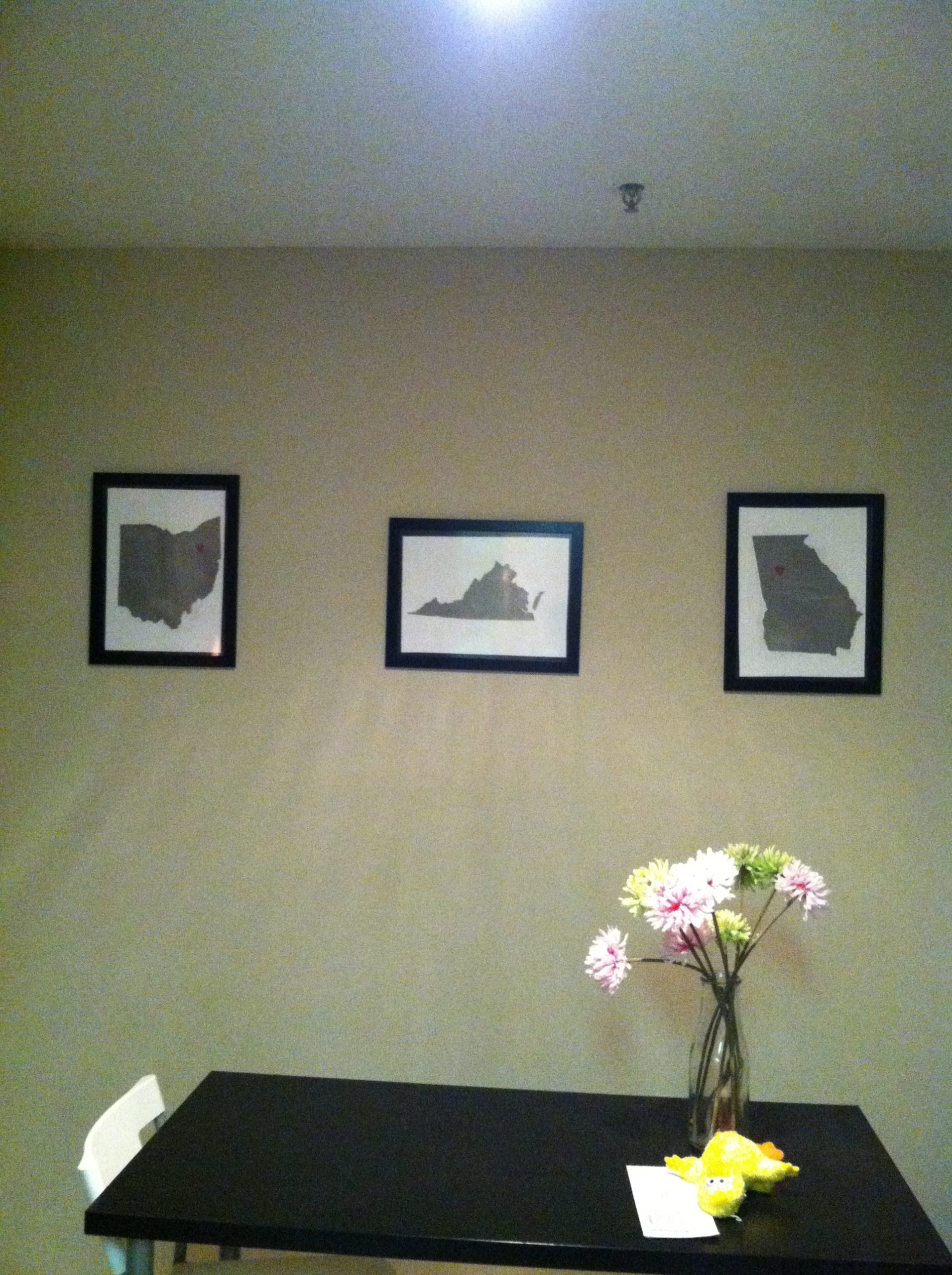 I also developed a liking for painting! I bought some cheap paint, converted my daughter’s crib to a daybed, and make it a pretty pink and gold color for her. I painted her easel and play kitchen the same. Lastly, I really liked an idea where you made silhouettes of each state you have lived in- it came from one of my favorite blogs (can you tell she’s my soul sister- she’s a lawyer lol). I made Ohio, Virginia, and Georgia for the states Raegan and I have lived together (although I have lived in 10 states and traveled in nearly all states). See if any of these ideas resonate with you- they helped me to see that what I had was already good.
