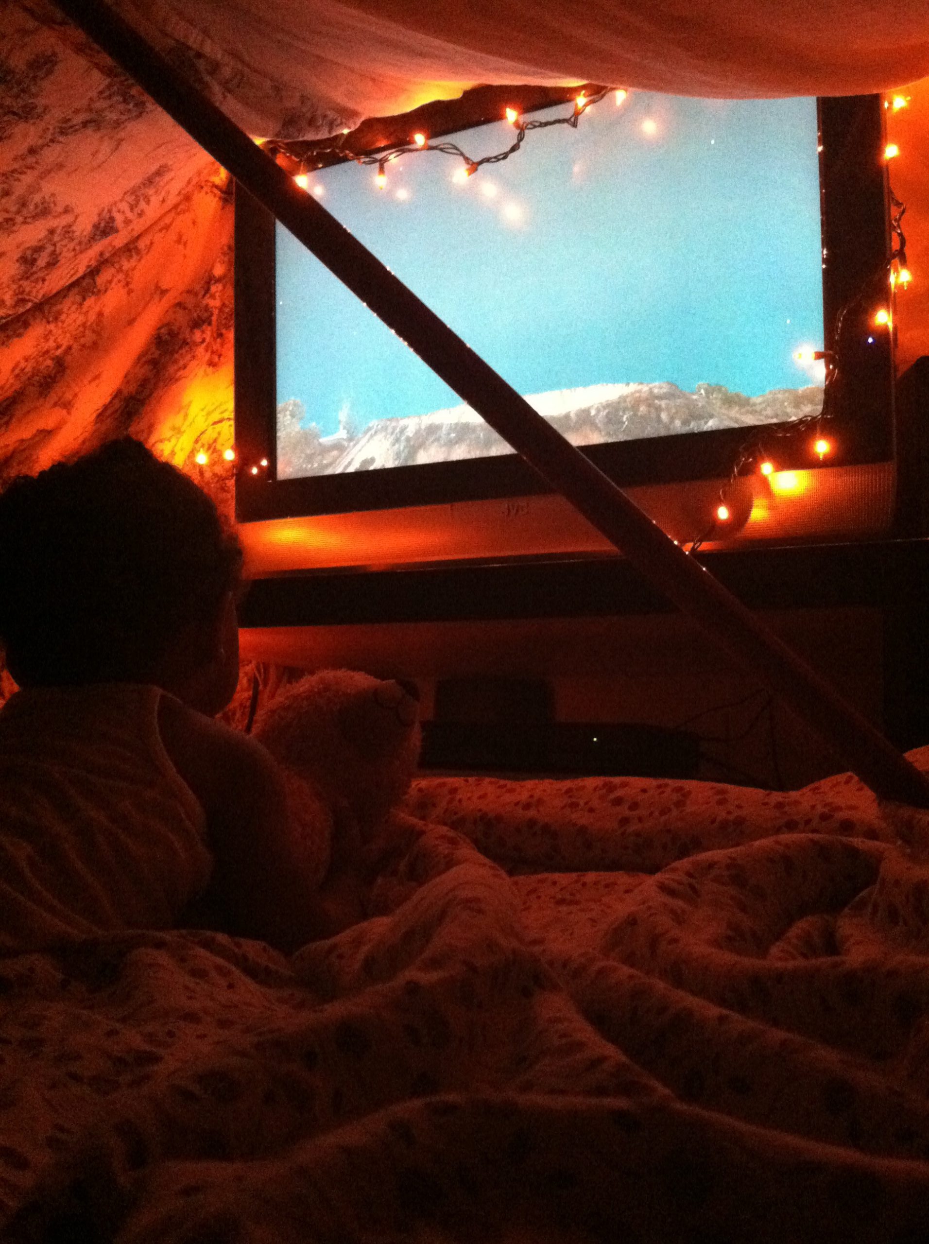 - Indoor camping/forts– The bottom right photo is of us camping out in our living room. I put up sheets and Christmas lights and we just watched DVDs and made s’mores on the stove. This can be done at any time of the year!