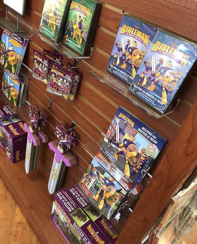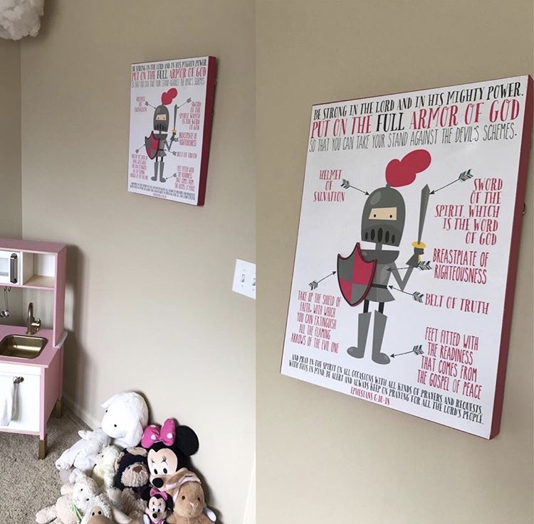 Example: This is Raegan’s basket from Easter. I did not want her to be focused on candy and bunnies (yes, there is a bunny on her basket; no it was not distracting from Jesus). Rather, she received age-appropriate materials discussing the importance of Easter. I also sat her down and explained Jesus’s death, His resurrection, and the fact that He sits at the right hand of the Father interceding on her behalf! Raegan declared, “Jesus lives forever!” all day long. - Be mindful of her environment — I do not allow secular music in our lives. I am mindful of the TV shows and movies she watches (I even check the background of the producing companies sometimes). I watch the toys she plays. Some of my favorite resources include Lifeway Christian Stores — they have a great kids section with books, games, toys, DVDs, and music. I love the Bibleman (pictured below on the right) and the Veggie Tales series. Joshua and I purchased children’s Christian music for her to listen to as we drive around town or on roadtrips. We also read books that do not dishonor God. Much in the same way I read books, listen to podcasts, listen to sermons, and listen to worship music, I provide the same age-appropriate opportunites for my child. Here and here are two great books I recommend, and here is a link to a children’s worship CD that Raegan loves. Of course, I listen to my favorite worship songs while driving, cleaning, or having my quiet time. My daughter’s favorite song right now is “All About You Jesus” by River Valley Worship. I am also conscious of how I decorate my home — I buy kid-appropriate art for her room with scriptures on it (found at Hobby Lobby, pictured below on the left). Lastly, I take her to participate in Christian events, such as poetry readings, etc.